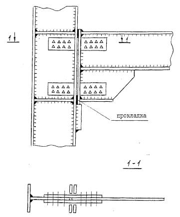 Рисунок В.4 - Болтовое соединение решетчатого ригеля с колонной с вертикальными накладками, пропущенными в прорези полки колонны и торцевой полки ригеля