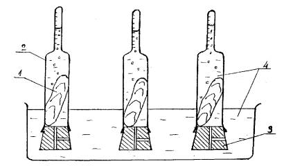 При этом методе в медную охлаждаемую проточной водой изложницу выбранным способом сварки наплавляется образец («карандаш») с овальным поперечным сечением и размерами 8´12´70 мм. Образец после охлаждения водой и очистки поверхности помещается в стеклянную заполненную спиртом (глицерином) тарированную пробирку-эвдиометр. Пробирка вместе с образцом и перфорированной пробкой помещается в емкость, заполненную той же жидкостью (рисунок Г.1). Объем выделяющегося с течением времени водорода вытесняет жидкость из верхней части пробирки и подвергается измерению. Измерение объема выделившегося водорода производится после выдержки в течение 1-3 суток. Измеренный объем относят к массе образца и выражают Ннш в единицах см3/100 г. Испытанию обычно подвергают три одинаковых образца; результаты измерений усредняют.