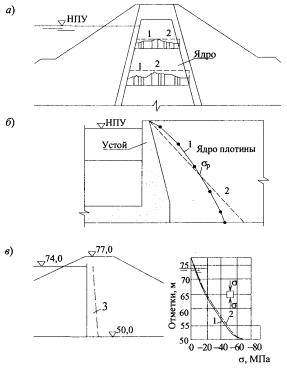 а - в ядре плотины; б - в грунте на поверхности устоя; в - в стальной диафрагме; 1 - натурная эпюра; 2 - расчетная эпюра; 3 - эпюра смещений диафрагмы Рисунок Д.1 - Натурные и расчетные эпюры нормальных сжимающих напряжений