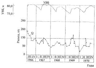 а - в годичном интервале наблюдений; б - в многолетнем интервале наблюдений; в - продольная поверхность депрессии по измерениям в пьезометрических створах Рисунок Д.7 - Кривые депрессии, полученные в результате обработки данных наблюдений