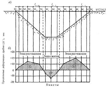 а - размещение марок М0, М1, М2, на гребне; б - эпюра деформаций гребня Рисунок Д.5 - Эпюра продольных деформаций гребня плотины