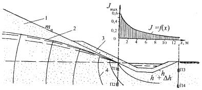 П1, П2, П3, П4 - контрольные точечные пьезометры 1 - низивой откос; 2 - поверхность депрессии; 3 - дренаж; 4 - линии равных напоров Рисунок Д.6 - Эпюра выходных градиентов напора (Jвых) в зоне разгрузки потока