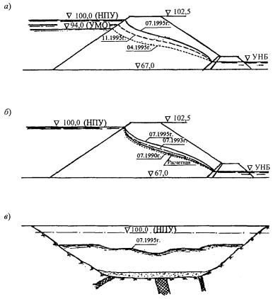 а) по данным наблюдений; б) по данным теплофизического моделирования Рисунок Ж.11 - Распределение температур в теле плотины и в основании (фрагмент, пример) 4.7 Кроме построения теплофизических моделей, по результатам анализа данных температурных наблюдений за грунтовой плотиной должны быть даны оценки температурного состояния: - противофильтрационных элементов (ядро, экран, диафрагма и др.); - переходных фильтровых зон и обратных фильтров; - дренажных устройств; - областей разгрузки фильтрационного потока из тела плотины и основания; - зон примыкания грунтовой плотины к устоям и стенкам бетонных сооружений, водосбросным и водоспускным трубам, проложенным внутри плотины; - низовой упорной призмы; - гребневых частей тела плотины и грунтового противофильтрационного элемента; - основания плотины и береговых склонов в пределах активных областей фильтрации 4.8 Диагностические показатели температурного состояния элементов системы плотина - основание по п. 4.7. сравниваются с их предельными критериальными значениями (критериями безопасности), определяющими эксплуатационные состояния сооружения и условия его эксплуатации, соответствующие допустимому уровню риска аварии. 4.9 Эксплуатационные состояния плотины оцениваются как нормальное - при котором плотина соответствует всем требованиям норм и проекта, при этом значения диагностических показателей не превышают своих критериальных значений первого (предупреждающего) уровня K1; потенциально опасное - при котором значение хотя бы одного диагностического показателя стало большим (меньшим) своего первого (предупреждающего) уровня критериальных значений или вышло за пределы прогнозируемого при данном сочетании нагрузок интервала значений; предаварийное - при котором значение хотя бы одного диагностического показателя стало большим (меньшим) второго (предельного) уровня критериальных значений K2. 4.10 В целом анализ и оценка эксплуатационных состояний плотины должны производиться комплексно на основе результатов всех видов контрольных наблюдений, проводимых на сооружении. Приложение И(рекомендуемое) Рекомендации по анализу данных и контролю состояния водосбросных сооружений и нижних бьефов гидроузловПредисловие Главная задача проведения наблюдений за водосбросными сооружениями гидроузлов и прилегающими участками нижних бьефов - это получение материалов, необходимых для обеспечения их эксплуатационной надежности. Получаемые в результате наблюдений данные позволяют контролировать надежность и безопасность сооружений, корректировать в отдельных случаях режимы их эксплуатации, оценивать состояние сооружений. Накопление и систематизация материалов наблюдений дает возможность совершенствовать проектирование и строительство новых объектов, совершенствовать правила эксплуатации гидроузлов. Основными требующими контроля вопросами наблюдений за водосбросными сооружениями являются: пропускная способность водосброса, состояние его поверхностей, режимы потока в пределах водосброса, гидродинамические (в том числе кавитационные) воздействия на сооружение, условия гашения энергии и состояние энергогасящих устройств в нижнем бьефе, развитие местного размыва русла и берегов, изменение уровня нижнего бьефа при трансформации русла на большом удалении от сооружения. В