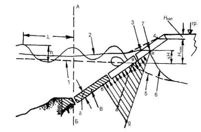 3.2 Регистрация характеристик волнения в водохранилище - направления, высоты, длины и периода волн - должна проводиться независимо от класса капитальности сооружения, сроков их эксплуатации и состояния креплений. Регистрации подлежат все случаи волнения с высотой волн 0,5 ми более. При этом обязательно должна быть зарегистрирована продолжительность волнения. Волнограммы должны содержать запись не менее 100 непрерывно следующих одна за другой волн. Указанное количество волн необходимо и достаточно для получения статистических характеристик волнения: математического ожидания (средних значений высоты, длины и периода волн), среднеквадратического отклонения, вероятности превышения зафиксированных параметров. 3.3 Отсутствие сведений о волновом режиме в водохранилище за длительный период исключает возможность установления причин появления повреждений и разрушений креплений, достоверной диагностики их состояния и прогноза на будущее. 3.4 Параметры волн измеряются непосредственно перед сооружением в створе АБ (рис. Е.1). Одновременно с регистрацией волны надлежит определять: положение кривой депрессии (точка 7) и высоту наката волн на откос (положение точки 4). Подъем кривой депрессии при волнении определяется путем фиксации уровня воды в пьезометрах.