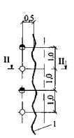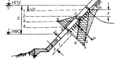 1 - уровень спокойной воды до начала волнения; 2 - уровень воды при ветровом и волновом нагоне; 3 - урез воды при волнении; 4 - линия наката волн на откос; 5 - кривая депрессии до начала волнения; 6 - кривая депрессии при воздействии волн; 7 - положение кривой депрессии на нижней поверхности плит при волнении; АБ - створ измерения параметров волн; В - плиты крепления; абв - гидростатическое давление в подплитной области при отсутствии волнения; дбг - то же при волнении; авгд - повышение гидростатического давления при волнении Рисунок Е.1 - Подъем кривой депрессии при волнении Высота наката определяется визуальными наблюдениями по линиям, нанесенным на поверхности крепления параллельно урезу воды с интервалом 10-20 см. На каждой линии должны быть указаны их геодезические отметки. Для удобства наблюдений линии следует пронумеровать. При нерегулярных волнах на подходе к сооружению накат их на откос является вероятностным, поэтому для численной оценки высоты наката следует фиксировать положение точки 4 при накатывании не менее 100 последовательных волн. По результатам измерения определяется средняя и максимальная высота наката, а также высота нормативной обеспеченности. Разность отметок гребня сооружения и точки наката является нормируемым запасом его высоты, равным 0,1hрасч (hрасч - высота расчетной волны в системе волн нерегулярного волнения). Уменьшение величины Нзап по сравнению со значениями ее, принятыми в проекте, может быть следствием двух факторов: превышением высоты волны по сравнению с принятой в проекте и осадки сооружения. 3.5 На водохранилищах суточного регулирования должны производиться измерения уровня воды с целью определения скорости сработки в пределах от НПУ до УМО (или иного наинизшего уровня сработки). Фиксацию уровней воды при суточном регулировании водохранилища следует проводить через интервалы времени ∆T = (0,2 - 0,25)Т (Т - продолжительность сработки). При этом одновременно проводятся измерения положения уровня воды в подплитной области. По результатам измерения определяется подъемная сила, действующая на плиты крепления. Схема, иллюстрирующая возможное несовпадение положения уровней воды над креплением и под ним, приведена на рис. Е.2. Наличие перепада Z свидетельствует об уменьшении коэффициента фильтрации грунта обратного фильтра вследствие его кольматажа. Допустимая величина Z определяется двумя требованиями: - должно быть соблюдено условие Z < 4δ (δ - толщина плиты); - градиент гидростатического давления в слое I толщиной у = 1 - 1,5 м не должен превышать критический градиент, при котором начинается суффозия в обратном фильтре и грунте тела сооружения (должно соблюдаться условие i < iкр). Критический градиент определяется экспериментально или расчетным путем. 3.6 При значениях Z > 4δ должно быть проведено обследование подплитной области - определение гранулометрического состава обратного фильтра и его фильтрационно-суффозионных характеристик. 3.7 При наличии волнения на промежуточных уровнях сработки подъемная сила гидростатического давления Р суммируется с силой волнового противодавления, определяемой по эпюре ogm (рис. Е.2).
