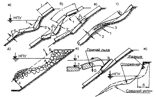 1, 2, 3, 4 - промежуточные положения уровня воды в водохранилище; Р - подъемная сила; Z - перепад уровней воды под плитой и в водохранилище; авс - эпюра гидростатического давления на верхнюю поверхность крепления при уровне воды 2; ngk - то же, на нижнюю поверхность крепления; degk - разность между давлением под плитой и на ее верхней поверхности; ogm - эпюра волнового противодавления Рисунок Е.2 - Сработка водохранилища 3.8 Наличие перепада Z может быть обнаружено визуально по фонтанированию воды из-под крепления в зоне наката-ската волны. 3.9 Плановые (обязательные) осмотры креплений и береговых склонов должны проводиться ежегодно один раз в квартал и в период наибольшей сработки водохранилища, внеплановые - в экстремальных случаях (землетрясения, катастрофические паводки, выбросы на откосы тяжелых плавающих тел и т.п.). 3.10 Визуальные наблюдения являются важной составной частью в общем комплексе работ по контролю состояния креплений откосов сооружений и береговых склонов. Результаты систематических (регулярных) осмотров в сочетании с данными о волновом и ледовом режимах являются основанием для приближенной оценки прочности и устойчивости креплений, ориентировочного прогноза развития зафиксированных повреждений и решения вопроса о необходимости (или необязательности) проведения обследований и исследований. В состав визуальных наблюдений обязательно должно быть включено проведение осмотра креплений в подводной части откоса водолазами, прошедшими специальную подготовку. 3.11 Возможные виды повреждений креплений и разрушений показаны на рис. Е.3: - схема а - осадки плит малых размеров (l/δ < 25), возникающие в результате выноса материала обратного фильтра и грунта тела сооружения через нарушенные стыки между плитами; - схема б - осадки и изгиб плит больших размеров в плане (l > 10 м) с нарушением сплошности опирания на откос и образованием трещин и размывов бетона; - схема в - локальная осадка плит без нарушения сплошности опирания, возникающая, как правило, вблизи от уреза воды на глубине (0,2-0,3)h (h - высота волны обеспеченностью 1% в системе); - схема г - деформация асфальтобетонного крепления с образованием трещин на участках наибольших прогибов и расслоения асфальта в плоскости арматурной сетки; - схема д - размыв каменной наброски в результате выноса мелких отдельностей через поры скелета и смещения отдельностей вниз по откосу; - схема е - поворот плит от нагрузки примерзшего массива льда (припая) при сработке водохранилища; - схема ж - размыв берега при уменьшении уклона и ширины прибрежной отмели, а также при повышении уровня грунтовых вод в грунте берегового надводного массива (уступа).