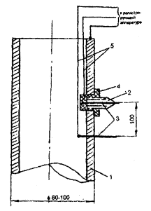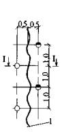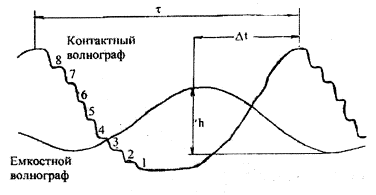 1 - направляющая обойма; 2 - корпус кассеты; 3 - датчик давления; 4 - вывод проводов к регистрирующей аппаратуре; 5 - колесо Рисунок Е.6 - Передвижная кассета с датчиками давления 4.8 Съемка участков размыва береговых склонов осуществляется обычными геодезическими приборами (нивелир, теодолит, тахеометр, мензула), а в труднодоступных местах на крутых береговых обрывах - фототеодолитом. Размеры оползневых массивов определяются по удалению оползневых трещин от края берегового уступа. 5 ОБРАБОТКА И ОБОБЩЕНИЕ ДАННЫХ ИЗМЕРЕНИЙ 5.1 Обработка информации, полученной при осмотрах и инструментальном контроле, должна производиться в объеме, необходимом для получения сведений о масштабах повреждений и разрушений и о развитии их во времени. Результаты обработки следует представлять в виде соответствующих графических зависимостей в координатах "измеренная величина - время". 5.2 Обработка данных о волновом режиме сводится к построению кривой обеспеченности высот воли при нерегулярном волнении, определению средней и максимальной высоты волны, средней длины и среднеквадратического отклонения. 5.3 По волнограмме, записанной одиночным волнографом, могут быть получены два параметра: высота воли и период. Для определения длины волны необходимо иметь на одной ленте две волнограммы, записанные разными волнографами, расположенными на расстоянии I один от другого по направлению распространения волн. Пример такой записи приведен на рис. Е.7. Длина волны определяется по зависимости