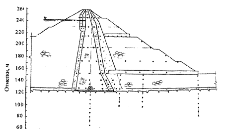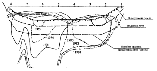 Рисунок Ж.9 - Изменение положения нулевой изотермы в створе плотины в период 1973 - 1984 гг. (пример) 4.2 Для анализа результатов наблюдений используются специальные теплофизические модели по наблюдательным створам объекта. Эти модели строятся на основе оценки состояния плотины в целом и каждого инженерно-геологического элемента конкретного створа, теплофизических свойств грунтов, наблюдений метеослужбы за температурой, влажностью воздуха, атмосферными осадками, ветром, снегомерной съемки и пр. 4.3 По разработанной теплофизической модели проводится расчет параметров температурного поля и динамика его развития, а также сравнение результатов наблюдений с данными прогнозного расчета температурного режима тела плотины и ее основания, выявление отклонений в динамике температурного поля от проектных предположений. В таких случаях должен проводиться анализ причин, вызвавших аномальное изменение температурного поля, а также разработка предложений по их устранению. 4.4 Прогнозные модели должны периодически уточняться с увеличением ряда наблюдений. 4.5 Анализ исходных данных и построение теплофизической и расчетной моделей должны проводиться специализированными научно-исследовательскими организациями. 4.6 Построение теплофизической и расчетной моделей, а также методика оценки соответствия температурного состояния проектному рассмотрены на примере плотины гидроузла Анадырской ТЭЦ. На основании систематизации имеющихся материалов по створу 2 была разработана модель теплофизических свойств системы "плотина - основание" по этому створу (рис. Ж.10). Теплофизические свойства элементов модели приняты по данным теплофизических исследований в и лабораторных условиях (на образцах). Краевые условия назначались на основе результатов работ мерзлотной службы Анадырской ТЭЦ, а также по данным метеослужбы.