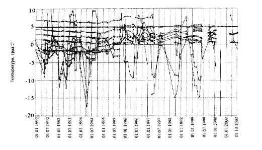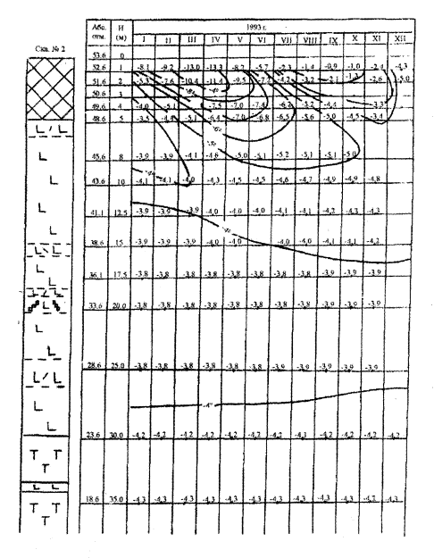 Рисунок Ж.3 - Форма журнала регистрации результатов измерений температур 3.3 При оборудовании КИА по варианту 2. Измерение температуры проводится путем последовательного опроса всех датчиков сети. Результаты измерений поступают на специальное запоминающее устройство для последующей распечатки на печатающем устройстве или переписке информации в память ЭВМ. Периодичность измерений та же, что и в случае варианта 1. При регистрации резких отклонений в изменении температуры (более чем на 1° от прогнозируемых критических значений в мерзлотной зоне или при угрозе ее протаивания и фильтрации) рекомендуется увеличить частоту замеров температуры до двух раз в месяц и чаще, если требуют обстоятельства. 3.4 При оборудовании КИА по варианту 3. Скважинные терминалы настраиваются на регистрацию температуры 1 раз в месяц. Опрос терминалов проводится с частотой, определяемой мерзлотными и температурными условиями. Кроме того, он может быть выполнен при специальных контрольных обследованиях сооружения, комиссиях и в научных целях. 3.5 Температурные наблюдения по скважинам сети КИА дают возможность контролировать температурный режим плотины и ее основания лишь в местах заложения скважин. Поэтому для достоверного анализа температурного состояния сооружения (основания) по данным КИА необходимо проведение комплекса дополнительных исследований температурного режима плотины (электрозондирование, профилирование). 3.6 Методы электрозондирования и профилирования позволяют весьма эффективно выявлять участки талых пород в толще мерзлых. Электроразведочные исследования проводятся по гребню плотины и по низовому ее откосу. С этой же целью может быть использован метод георадиолокации. 3.7 Для выявления участков повышенной фильтрации из водохранилища используется комплекс измерения температуры и естественного электрического поля в подводной части верхового откоса плотины и на участке дна, примыкающего к плотине. 3.8 Перечисленные исследования должны проводиться в случае регистрации в теле плотины аномального развития температурных процессов, не предусмотренных проектом. Кроме того этот комплекс рекомендуется в качестве режимных наблюдений, которые проводятся 1 раз в год в период максимального оттаивания грунтов (сентябрь - октябрь). Для проведения этих работ привлекаются специализированные научно-технические организации. 3.9 Визуальные наблюдения являются обязательной составной частью режимных наблюдений за температурным состоянием плотины. Сотрудники мерзлотной службы объекта должны внимательно следить за возникновением и динамикой развития трещин в теле плотины и выходов воды на низовом откосе и в нижнем бьефе. 3.10 При обнаружении водопроявлений должен быть проведен отбор гидрохимических проб. Путем сопоставления химического состава воды из источников и водохранилища определяется природа возникновения водопроявлений. В зимний период необходимо проведение измерений мощности снежного покрова, наличия наледей, определение химического состава наледного льда, фиксация выходов воздушных потоков на низовом откосе каменно-набросных плотин ("продухов"). 4 ОБРАБОТКА И АНАЛИЗ РЕЗУЛЬТАТОВ НАБЛЮДЕНИЙ, ОЦЕНКА СОСТОЯНИЯ ПЛОТИНЫ 4.1. По результатам режимных температурных наблюдений строятся: - графики изменения температур пород во вр