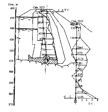 Рисунок Ж.5 - Термограммы ядра и низовой призмы плотины (пример)