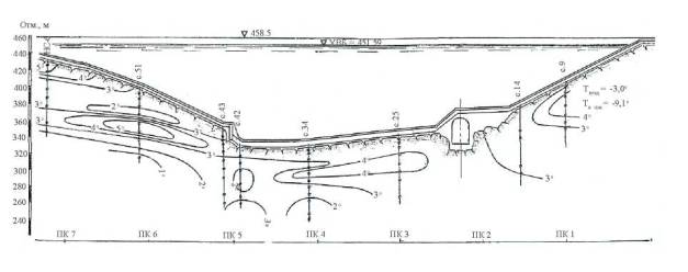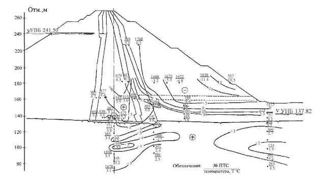 Рисунок Ж.7 - Изотермы в поперечном створе плотины на определенную дату (пример)