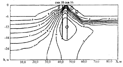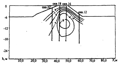 Рисунок Ж.8 - Изотермы в основании плотины на определенную дату (пример)