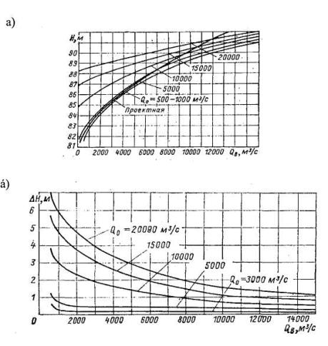 а - безнапорный поверхностный водосброс Вилюйских ГЭС-1 и 2; б - глубинный эксплуатационный водосброс Саяно-Шушенской ГЭС Рисунок И.1 - Характерные формы кривых пропускной способности 4.4 Строятся кривые свободной поверхности воды (кривые наполнения водовода) при различных открытиях затворов и разных расходах или уровнях верхнего (нижнего) бьефа. При пропуске расходов близких к расчетным обязательно должны фиксироваться данные для этих кривых. 4.5 При наличии датчиков кавитационного излучения начальная стадия кавитации фиксируется по увеличению уровня ультразвукового шума. 4.6 Возникновение кавитации и возможность появления кавитационной эрозии могут быть установлены также на основе измерений осредненных или мгновенных значений пьезометрических напоров, зафиксированных пьезометрами или датчиками давлений. Кавитационная эрозия может возникнуть, если параметр (число, коэффициент) кавитации K меньше коэффициента начала кавитационной эрозии: