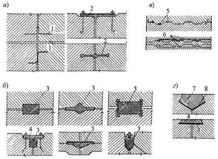 а - диафрагмы из металла, резины и пластических масс; б - шпонки и прокладки из асфальтовых материалов; в - инъекционные (цементация и битумизация) уплотнения; г - брусья и плиты из бетона и железобетона; 1 - металлические листы; 2 - профилированная резина; 3 - асфальтовая мастика; 4 - железобетонная плита; 5 - скважины для цементации; 6 - цементационные клапаны; 7 - железобетонный брус; 8 - асфальтовая гидроизоляционная прокладка Рисунок К.2 -Схемы основных уплотнений деформационных швов бетонных и железобетонных плотин 2.5 При разработке проектов ремонта уплотнений деформационных швов следует соблюдать следующие требования: - материал уплотнения должен непосредственно примыкать к бетону секций, образующих шов; - величина напряжения на контакте асфальтового или иного материала уплотнения с бетоном в рассматриваемом сечении должна быть не менее величины внешнего гидростатического давления воды в том же сечении; - средние градиенты напора фильтрационного потока через бетон по контуру уплотнений шва не должны превышать: для гравитационных и массивно-контрфорсных плотин - 25; для арочных и арочно-гравитационных плотин и для арочных напорных перекрытий многоарочных плотин - 50. 3 ОЦЕНКА РАБОТОСПОСОБНОСТИ ШВА И НЕОБХОДИМОСТИ РЕМОНТА ЕГО УПЛОТНЕНИЙ 3.1 Основными факторами, определяющими необходимость ремонта уплотнений деформационных швов, являются: - появление и нарастание фильтрации воды через шов; - разрушение уплотнений шва. - Причинами фильтрации воды через шов могут быть: - некачественное выполнение шва, его уплотнений или неудачная их конструкция, не отвечающая условиям работы шва; - неудачный выбор материала уплотнения, не соответствующего условиям и требованиям надежной работы конструкции; - старение, разрушение и вытекание (в случае мастичного) уплотнения шва и окружающего (формирующего) шов бетона. 3.2 Вода может фильтровать через бетон, поэтому прежде, чем принимать решение о ремонте уплотнений шва, необходимо выявить природу поступающей в него воды, степень водопроницаемости бетона в области шва, степень водопроницаемости уплотнений и самого шва. Степень водонепроницаемости бетона и деформационных швов в тонкостенных бетонных конструкциях оценивается визуально или при помощи установок и приборов для определения водопроницаемости (воздухопроницаемости) элементов бетонных и железобетонных конструкций в производственных условиях. Степень водонепрницаемости бетона в массивных сооружениях и доля в нем водонепрницаемости деформационных швов при решении о необходимости их ремонта может быть оценена: инструментально; путем сравнения расходов воды, вытекающей через соседние (аналогичной конструкции) швы сооружения. 4 МАТЕРИАЛЫ ДЛЯ РЕМОНТА УПЛОТНЕНИЙ ДЕФОРМАЦИОННЫХ ШВОВ И ТРЕБОВАНИЯ К НИМ 4.1 Общие требования 4.1.1 Для ремонта уплотнений деформационных швов обычно используются те же материалы, что и для их выполнения в период строительства: горячие и холодные асфальтовые, полимербитумные, полимерные мастики и горячие и холодные асфальтовые полимербитумные и полимерные растворы; инъекционные (заливочные) цементные, цементно-песчаные, полимерцементные, полимерминеральные и полимерные растворы; металлические листовые материалы; асфальтовые, полимербитумные и полимерные герметики; профильные резиновые уплотнительные л