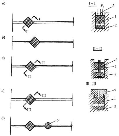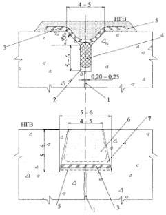 а - создание дополнительного давления на торце шпонки; б - замена материала заполнения на более вязкий; в - устройство трубчатого электронагревателя; г - пригрузка бетонным штампом; д - устройство запасной шахты и заполнение асфальтовым материалом с заданной вязкостью; 1 - асфальтовая шпонка; 2 - бетон сооружения; 3 - опрессовка; 4 - электронагреватель; 5 - бетонный вкладыш; 6 - дополнительная шпонка Рисунок К.3 - Ремонт шпонок малого сечения 6.2.7 Заливка полости шпонки может при этом производиться двумя способами: - при возможности осушения пробуренной скважины ее полость заполняется самотеком асфальтовой мастикой, разогретой до 160 °С (при изготовлении на вязком строительном битуме) и до 180 °С (на строительном битуме); - при невозможности осушения скважины ее заполнение может быть осуществлено: через трубу нагнетанием (через автоклав или насосом); самотеком через трубу, постоянно поднимаемую по мере заполнения скважины; заливкой под воду через верхний конец скважины. 6.2.8 При нагнетании асфальтовой мастики через трубу следует установить в полость вновь пробуренной шпонки по ее центру электронагреватель, а затем через нагнетательную трубу произвести заливку полости шпонки, одновременно включив трубчатый электронагреватель. После заполнения скважины питательная труба вынимается наружу. Заполнение производится поэтапно. 6.2.9 Время заполнения скважины асфальтовой мастикой через трубу нагнетанием определяется по времени проявления ее "отказа" при нагнетании. 6.2.10 При заливке разогретого до 160 °С асфальтового материала в воду происходит парообразование, что может привести к возникновению в нем неплотностей. Для уплотнения в полости шпонки пористого асфальтового материала необходимо произвести дополнительный его электрообогрев. В этом случае поры в асфальтовом материале, частично заполненные водой и паром, будут обезвожены, что даст возможность добиться необходимой водонепроницаемости новой шпонки. 6.3 Ремонт шпонок большого сечения 6.3.1 Одним из наиболее реальных способов ремонта шпонок большого сечения является их разогрев имеющимися в полости шпонок электронагревателями с последующей их дозаливкой асфальтовой мастикой. 6.3.2 В случае, если указанным в п. 6.3.1 способом невозможно прекратить фильтрацию воды через уплотнение, то необходимо перед фильтрующей шпонкой большого сечения пробурить временную шпонку малого сечения (по пп. 6.2.6 - 6.2.9) и под ее защитой произвести ремонт основного уплотнения, а именно: - очистить шпонки и участок полости шва между ними от асфальтового материала и мусора; - заделать швы и щели между плитами-оболочками и бетоном (рис. К.4, К.5); - смонтировать и установить в полости шпонки трубчатый электронагреватель; - залить шпонки асфальтовой мастикой (см. пп. 6.2.7 - 6.2.9).
