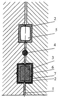 1 - деформационный шов; 2 - железобетонный короб; 3 - асфальтовая мастика; 4 - дополнительная асфальтовая шпонка; 5 - смотровой колодец; 6 - цементационные скважины; 7 - зона инъекционного заполнения асфальта Рисунок К.5 - Усиленный вариант ремонта асфальтового уплотнения, выполненного в железобетонных коробах путем устройства дополнительного асфальтового уплотнения и цементации зоны контакта железобетонного короба и массива бетона