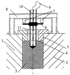 1 - секция первой очереди бетонирования; 2 - секция второй очереди бетонирования; 3 - асфальтовый материал заполнения; 4 - переносной трубчатый электронагреватель; 5 - направляющая втулка; 6 - крестовина, монтируемая на переносном электронагревателе; 7 - домкраты; 8 - жесткая опорная рама с направляющим отверстием; 9 -электропитание нагревателя; 10 - внутренний электрод d = 12 - 14 мм; 11 - наружный электрод в виде трубы d = 50 мм Рисунок К.6 - Переносной электронагреватель 6.4 Ремонт фильтрующих уплотнений, выполненных из металлических диафрагм 6.4.1 При фильтрации воды в обход уплотнения, выполненного из металлических диафрагм, могут быть рекомендованы следующие ремонтные технологии (рис. К.7): - цементация или битумизация деформационного шва, расположенного между уплотнением и смотровым колодцем; - устройство дополнительной асфальтовой шпонки, пробуренной в шве между уплотнением и смотровым колодцем; - заполнение асфальтовой мастикой смотрового колодца в целях образования нового асфальтового уплотнения; - проведение инъекционных работ в зоне установки металлических диафрагм.