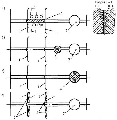 I - скважины первой очереди цементации; II - скважины второй очереди цементации а - цементация шва между металлическими диафрагмами: 1 - металлическая диафрагма; 2 - инъекционное заполнение шва; б - бурение и устройство дополнительной асфальтовой шпонки: 1 - металлическая диафрагма; 3 - дополнительная асфальтовая шпонка; 7 - смотровой колодец; в - заполнение асфальтовой мастикой смотрового колодца: 1 - металлическая диафрагма; 4 - смотровой колодец, заполненный асфальтовой мастикой; г - инъекция в зоне расположения металлических диафрагм: 1 - металлическая диафрагма; 5 - цементационные трубы; 6 - зона цементации; 7 - смотровой колодец Рисунок К.7 - Варианты ремонта уплотнений из металлических диафрагм 6.4.2 Цементация или битумизация деформационного шва, расположенного между металлическими диафрагмами, производится по общим правилам проведения этих работ. 6.4.3 Устройство дополнительной асфальтовой шпонки, пробуренной перед первым рядом уплотнений или за последним рядом диафрагм, производится в соответствии с рекомендациями, изложенными в пп. 6.2.6 - 6.2.9. 6.4.4 При наличии за фильтрующим асфальтовым уплотнением, выполненным в виде шпонки большого сечения смотрового колодца, можно произвести его заполнение горячей асфальтовой мастикой или асфальтовым раствором (см. пп. 6.2.7 - 6.2.9). 6.4.5 При невозможности проведения ремонтных работ в соответствии с рекомендациями, приведенными в пп. 6.4.2 - 6.4.4, производится бурение инъекционных скважин диаметром не более 76 мм по контуру установки металлических диафрагм или наклонных скважин с последующим проведением инъекционных работ по омоноличиванию контакта бетон секций - металлическая диафрагма (рис. К.8). Бурение скважин и последующая цементация контакта производится по общим правилам проведения цементационных работ.
