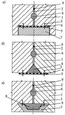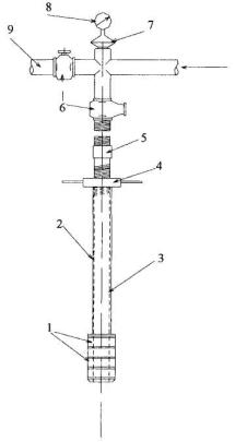 1 - резиновый уплотнитель; 2 - труба распорная; 3 - труба нагнетательная; 4 - гайка прижимная; 5 - муфта; 6 - кран запорный; 7 - предохранитель; 8 - манометр; 9 - сбросная линия Рисунок Л.3.10 - Тампон-нагнетатель для глубоких скважин