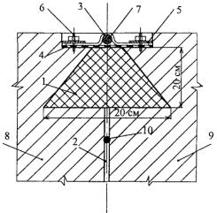 1 - асфальтовая шпонка; 2 - шов; 3 - металлический компенсатор; 4 - промасленный войлок; 5 - прижимные листы; 6 - анкерное крепление; 7 - пороизол; 8, 9 - секции бетонирования; 10 - уплотнение из цементной шпонки Рисунок К.9 - Устройство контурных ремонтных уплотнений швов внутри сооружения (галереи, машинный зал, потерны) 7 КОНТРОЛЬ КАЧЕСТВА РЕМОНТНЫХ РАБОТ 7.1 При проведении цементационных работ при ремонте уплотняющих конструкций деформационных швов оценку результатов ремонта следует проводить на основе визуального осмотра состояния швов по смотровым колодцам или потернам. 7.2 Контроль качества включает в себя также и оперативную проверку качества используемых материалов, состава раствора, соответствие технологии ремонта проектным требованиям. С этой целью, при производстве ремонтных работ инъекционным способом, должны заполняться журналы цементации, акты, ведомости, отражающие соблюдение проектных требований к технологии и материалам. 7.3 При приемке ремонтных работ должны предъявляться следующие документы: - исполнительные чертежи; - результаты испытания цементов и добавок; - журналы опытного гидроопробования; - акты приемки скважин; - акты испытания контрольных скважин; - акты ликвидации скважин; - сводный отчет по проведенным работам. 7.4 При приготовлении асфальтовых заливочных смесей должны контролироваться: - качество применяемых исходных материалов; - точность дозировки битума и минеральных материалов согласно принятому в проекте составу асфальтовых заливочных материалов (смесей); - температурный режим приготовления смеси и температура ее при выдаче к заливке в полость шпонки или шва; - качество готовой смеси и ее соответствие требованиям. 7.5 Состав асфальтовых заливочных смесей должен подбираться лабораторным способом в зависимости от их назначения и свойств исходных материалов для каждого конкретного объекта. 7.6 Температура асфальтовой мастики при заливке полости шпонки должна быть не выше 160 °С при приготовлении ее на вязком дорожном битуме и не выше 180 °С - на строительном битуме, соответственно не ниже 140 и 160 °С. 7.7 При использовании асфальтовых заливочных смесей контролируется их плотность, которая должна составлять 1,7 - 1,8 т/м3. 8 ТЕХНИКА БЕЗОПАСНОСТИ ПРИ РЕМОНТЕ УПЛОТНЕНИЙ ДЕФОРМАЦИОННЫХ ШВОВ 8.1 При производстве асфальтовых работ должны соблюдаться правила и нормы техники безопасности. 8.2 Цементационные установки и растворные узлы должны быть закрыты от ветра и дождя, а при работе в зимнее время помещения, где размещаются механизмы, должны быть утеплены и отапливаться. 8.3 Хранение в помещении цементационных установок и растворных узлов горюче-смазочных, воспламеняющихся и вредных химических веществ запрещается. 8.4 Все открытые и движущиеся части цементационных механизмов и машин должны быть снабжены ограждениями, исключающими возможность травмирования людей и попадания в механизмы и машины посторонних предметов. 8.5 Электронагреватели и пусковая аппаратура буровых и цементационных машин должны быть защищены от попадания на них воды и раствора. 8.6 После окончания монтажа все трубопроводы для цементного раствора и воды, работающие под давлением, должны быть испытаны при давлении, превышающем в 1,5 раза максимальное рабочее давление. 8.7 Наладка, смазка и ремонт буровых и цементационных механизмов без их останов