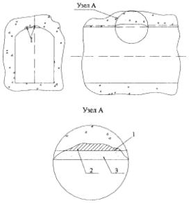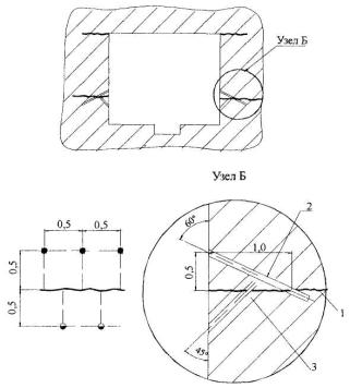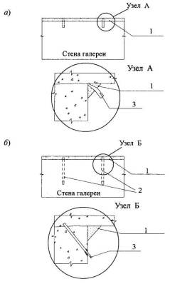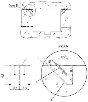 а - вариант без бурения шпуров; б - вариант с бурением шпуров; 1 - цементно-песчаный раствор; 2 - скважина; 3 - патрубок Рисунок Л.3.2 - Схема локализации угловых трещин (швов) с организацией сбора фильтрующей воды и последующим уплотнением инъектированием