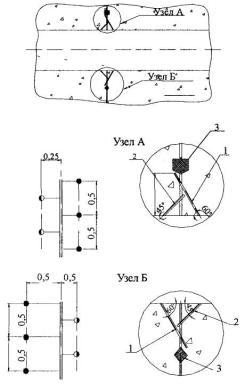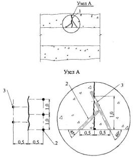 Схема бурения и инъекции: 1, 3 - битумная шпонка Размеры в метрах Рисунок Л.3.14 - Уплотнение температурных швов инъекцией