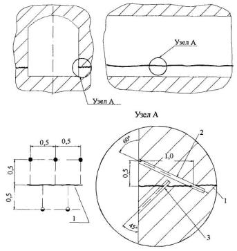 - трещина; 2, Размеры в метрах Рисунок Л.3.6 - Уплотнение трещин стен галереи инъекцией