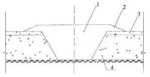1 - цементно-песчаная пробка; 2 - откос; 3 - бетонная стяжка; 4 - бетонная подготовка пола (днища) Рисунок Л.3.16 - Ликвидация очага фильтрации в днище