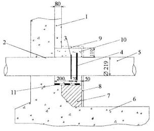1 - внутренняя сторона стены; 2 - кольцевая ниша; 3 - среднее сборное стальное кольцо; 4 - большое сборное стальное кольцо; 5 - трубопровод; 6 - днище; 7 - опорный фундамент; 8, 9 - опалубочные шины; 10 - изолирующий куб; 11 - прокладка из рубероида. Размеры в сантиметрах Рисунок Л.3.17 - Восстановление водонепроницаемости сопряжения трубопровода со стеной подземной части насосной станции