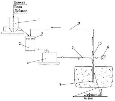 1 - растворитель; 2 - бак-накопитель (необходим при отсутствии бункера в растворонасосе); 3 - труба нагнетательная; 4 - растворонасос; 5 - напорный растворопровод; 6 - манометр; 7 - инъектор; 8 - скважина; 9 - сливной растворопровод; 10 - запорная арматура Рисунок Л.3.18 - Принципиальная схема установки для нагнетания цементного раствора