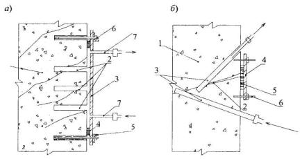 а - при наличии трещиноватой зоны: 1 - трещиноватый массив; 2 - скважины; 3 - прижимная планка; 4 - уплотнение (войлок, резина); 5 - уголок; 6 - анкер; 7 - патрубки для нагнетания и отвода раствора; б - при наличии одиночной трещины: 1 - бетонный массив; 2 - фильтрующая трещина; 3 - скважины для нагнетания и отвода раствора; 4 - прижимная планка; 5 - уплотнение; 6 - анкер Рисунок Л.3.19 - Технологические схемы уплотнения фильтрующего бетона Приложение 2к приказу ОАО РАО "ЕЭС России" от 13.03.2008 № 106 ПЕРЕЧЕНЬ