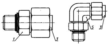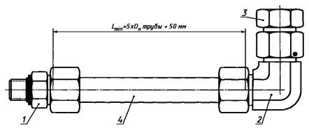 Испытуемый блок соединений трубопроводов с ввертным концом без трубы 1 - ввертное прямое соединение; 2 - угловое соединение; 3 - заглушка или пробка; 4 - труба; 5 - угловое соединение с ввертным концом, регулируемым по направлению
