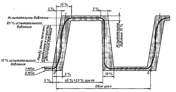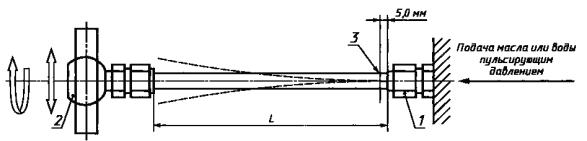 Рисунок 2 - Диаграмма цикла пульсации давления Одновременно испытуемые соединения трубопроводов подвергают вибрационным внешним нагрузкам изгибом в одной плоскости или круговым изгибом при частоте вибрации 10 - 20 Гц с базой испытаний не менее 5 - 105 циклов. Напряжение на конце трубы при изгибе должно быть приравнено 0,25 предела текучести материала трубы. Примечание - При использовании трубы, предел текучести материала которой будет равен 235 МПа и выше, следует принимать во внимание ее динамические характеристики для определения величины допускаемого напряжения. Частоту пульсации давления и вибрации следует выбирать таким образом, чтобы испытания заканчивались одновременно. Соединения трубопроводов считать выдержавшими данные испытания, если при визуальном контроле не обнаружено утечки и механических разрушений деталей соединения. Повреждение трубы не является критерием отказа. Длина трубы L должна быть равна: 250 мм - для трубы с Dн до 20 мм включительно; 8 Dн - для трубы с Dн свыше 20 мм до 50 мм включительно; более 400 мм или 8 Dн - для трубы с Dн свыше 50 мм. Труба должна быть установлена таким образом, чтобы самая тонкая часть ее стенки располагалась в плоскости нагрузки. Толщину стенки трубы следует выбирать из условия, чтобы сумма всех нагрузок не превышала максимально допускаемого напряжения. Толщина стенки трубы в зависимости от марки материала и максимального рабочего давления приведена в приложении Г. Типовая установка для проведения испытаний на стойкость соединений трубопроводов к одновременному воздействию пульсации давления и вибрации приведена на рисунке 3.