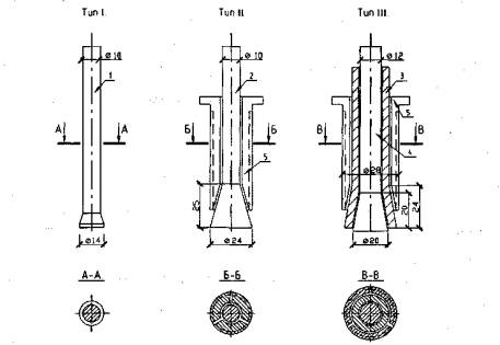 Рис 1 Анкерные устройства 1 - рабочий стержень, 2 - рабочий стержень с разжимным конусом, 3 - рабочий стержень с полым разжимным конусом, 4 - опорный стержень, 5 - щеки сегментные рифленые