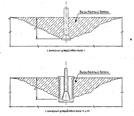 Рис 2 Глубина забелки анкерных устройств (h) и характер разрушения бетона при его испытании Таблица 1