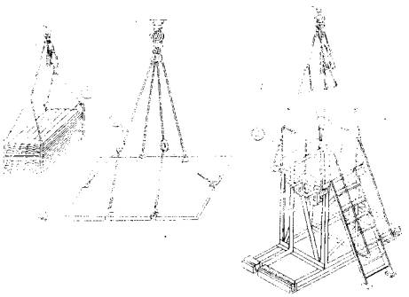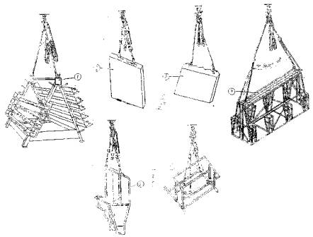 Кроме этого, с помощью винтов выполняется рихтовка и выверка смонтированных элементов. Применение треугольных стоек позволяет высвободить дефицитные подкосы с целью применения их для временного закрепления НС. Универсальное грузозахватное устройство предназначено для монтажа всех конструкций и материалов крупнопанельных домов. Оно обеспечивает автоматический перевод панели перекрытия из вертикального положения в горизонтальное во время ее подъема и подачи к месту укладки, строповку и возможность монтажа наружных и внутренних стен, перегородок, тюбингов лифтовых шахт, сантехкабин и прочих элементов при различном количестве и расположении подъемных петель и дает возможность производить расстроповку их с рабочего места монтажника (уровня перекрытия) (рис 12, 13, 14, 15).