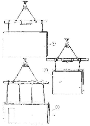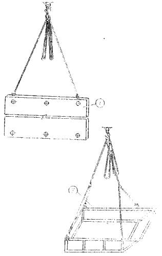 Рис. 7. Универсальное грузозахватное устройство Цель испытаний В процессе заводских испытаний образца должно быть выявлено следующее: а) соответствие изготовленного изделия рабочим чертежам проекта; б) работоспособность конструкции; в) прочность конструкции; г) комплектность изделия. Подготовка к испытаниям Для проведения испытаний назначается комиссия из представителей завода-изготовителя и других заинтересованных организации. Комиссии по проведению испытании должна быть представлена следующая документация: а) техническое задание на проектирование; б) комплект рабочих чертежей; в) паспорт; г) технические условия; д) ведомость отступлений от проекта с указанием лиц, разрешивших и согласовавших отступления; е) акт о приемке ОТК; ж) программа и методика испытаний; з) инструмент и приспособления для замеров. К заводским испытаниям образец должен быть представлен в неокрашенном виде. Условия должны быть выбраны приближенными к последующей эксплуатации образца. Материалы и выводы комиссии по заводским испытаниям оформляются актом, утверждаемым руководством завода. На основании утвержденного акта заводских испытаний, в случае необходимости, проводятся дополнительные конструкторские работы, изготовление новых деталей и сборных единиц и повторное испытание по усмотрению и под наблюдением комиссии по заводским испытаниям, составляющей в этом случае дополнительный акт. X. Объем и содержание испытаний универсального винтового захватаВ объем испытаний входят: а) внешний осмотр; б) испытания без нагрузки; в) статические испытания; г) динамические, испытания. При внешнем осмотре проверяется точное соответствие размеров изготовленных элементом захвата размерам, указанным в чертежах (рис. 1). При испытании без нагрузки проверяется правильность установки захвата (рис. 8, поз. 2). При статическом испытании к верхнему кольцу захвата необходимо приложить вертикальную нагрузку, равную 2,7 тс, и проимитировать подъем панели.