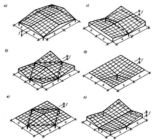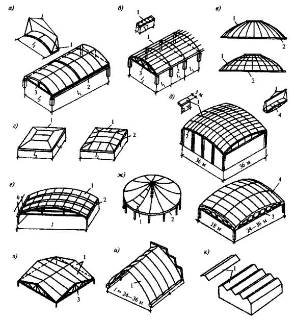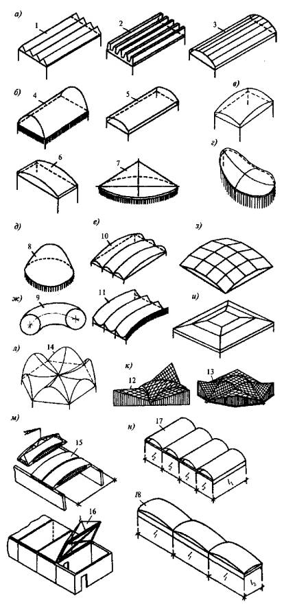 а - призматические складки; б - оболочки нулевой гауссовой кривизны; в - оболочки положительной гауссовой кривизны; г - то же, отрицательной; д - оболочки с вертикальной осью вращения; е - оболочки с горизонтальной осью вращения; ж - тороидальные оболочки разнозначной гауссовой кривизны; з - многогранники; и - то же, шатрового типа; к - составные оболочки; л - то же, из гиперболических треугольных сводов; м - панели-оболочки размером на пролет покрытия (КЖС) и вспарушенные оболочки размером на ячейку здания; н - неразрезные оболочки; 1 - балочная складка с треугольным поперечным сечением; 2 - то же, с трапециевидным; 3 - то же, со сводчатым (призматические выпуклые складки); 4 - свод-оболочка; 5 - длинные цилиндрические оболочки, 6 - то же, короткие; 7 - коническая оболочка; 8 - купол; 9 - тороидальная оболочка; 10 - бочарные своды; 11 - гиперболические оболочки; 12 - покрытие с треугольным планом из оболочек положительной и отрицательной гауссовой кривизны; 13 - то же, с полигональным планом; 14 - покрытие из составных гипаров; 15 - панели-оболочки КЖС; 16 - вспарушенные плиты-оболочки; 17 - многоволновые оболочки; 18 - многопролетные оболочки Рисунок 4.1 - Схемы тонкостенных пространственных конструкций покрытий и перекрытий по очертанию срединной поверхности а) складки с различной формой поперечного сечения, в том числе складчатые своды и оболочки (рис. 4.1, а); б) оболочки и своды нулевой гауссовой кривизны - цилиндрические и конические оболочки и цилиндрические своды (рис. 4.1, б); в) оболочки и волнистые своды положительной гауссовой кривизны - сферические оболочки и купола, очерченные по поверхностям вращения с вертикальной осью (рис. 4.1, д); оболочки, очерченные по поверхности переноса в виде эллиптического параболоида, круговой поверхности (рис. 4.1, в) и бочарные своды (рис. 4.1, е, 10); г) оболочки и волнистые своды отрицательной гауссовой кривизны - оболочки, очерченные по линейчатым поверхностям гиперболического параболоида (гипары) (рис. 4.1, г); и по поверхностям вращения с горизонтальной осью (рис. 4.1, е, 11); д) оболочки разнозначной гауссовой кривизны - тороидальные оболочки (рис. 4.1, ж); поверхности которых имеют на некоторых участках положительную, а на других - отрицательную кривизну (между точками А и В на рис. 4.1, ж), коноиды (поверхность которых имеет в большей части нулевую гауссову кривизну) и параболические оболочки на плоском контуре (в основном положительной кривизны), угловые участки которых имеют отрицательную гауссову кривизну и др.; е) многогранники, в том числе вписанные в поверхности оболочек, предусмотренные подпунктами б, в, г, д (рис. 4.1, з); а также шатровые складки (рис. 4.1, и); ж) составные оболочки, имеющие сложную поверхность, образуемые из оболочек, предусмотренных подпунктами б, в, г, д, е (рис. 4.1, к, л); з) вспарушенные плиты, в том числе ступенчато-вспарушенные шатровые и рамно-шатровые панели (рис. 4.1, м, 16); по форме перекрываемой площади (при опирании на стены, фундаменты или отдельные опоры) и конструктивным особенностям а) на круглом плане; б) на овальном (эллиптическом) плане; в) на квадратном плане; г) на прямоугольном плане; д) на треугольном плане; е) на полигональном плане; ж) кольцевые тороидальные и составные оболочки; з) неразрезные многоволновые оболочки, многогранники и складки; и) неразрезные многопролетные оболочки, многогранники и складки; к) висячие об