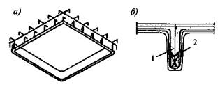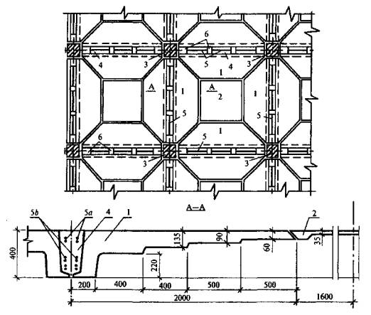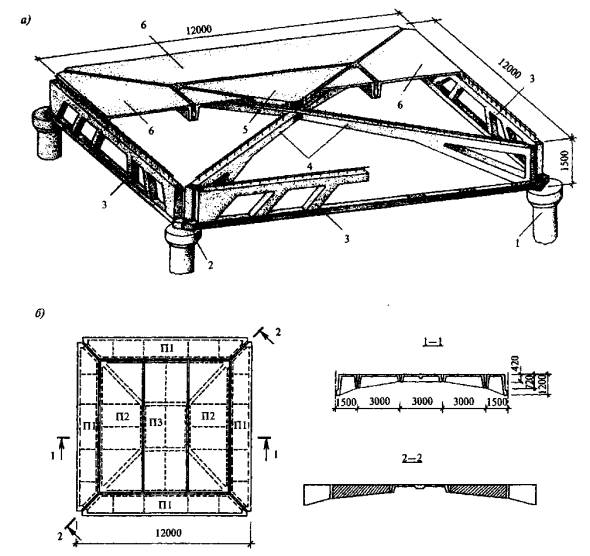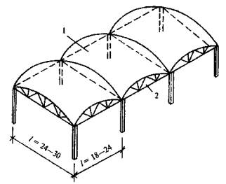 а - тонкостенный коробчатый железобетонный или армоцементный элемент; б - деталь поперечного сечения конструкции; 1 - монолитный бетон; 2 - выпуски арматуры из несущей опалубки Рисунок 6.2 - Сборно-монолитные оболочки с использованием несущей железобетонной или армоцементной опалубки 6.2.2 При проектировании сборно-монолитных конструкций с целью упрощения лесов и подмостей рекомендуется предусматривать сборные диафрагмы, бортовые элементы или ребра в соответствии с принятым проектом организации работ. Схема сборно-монолитной оболочки покрытия промышленного здания приведена на рис. 6.3. Сборные диафрагмы и бортовые элементы могут быть железобетонными, в том числе с несущей арматурой, и металлическими.