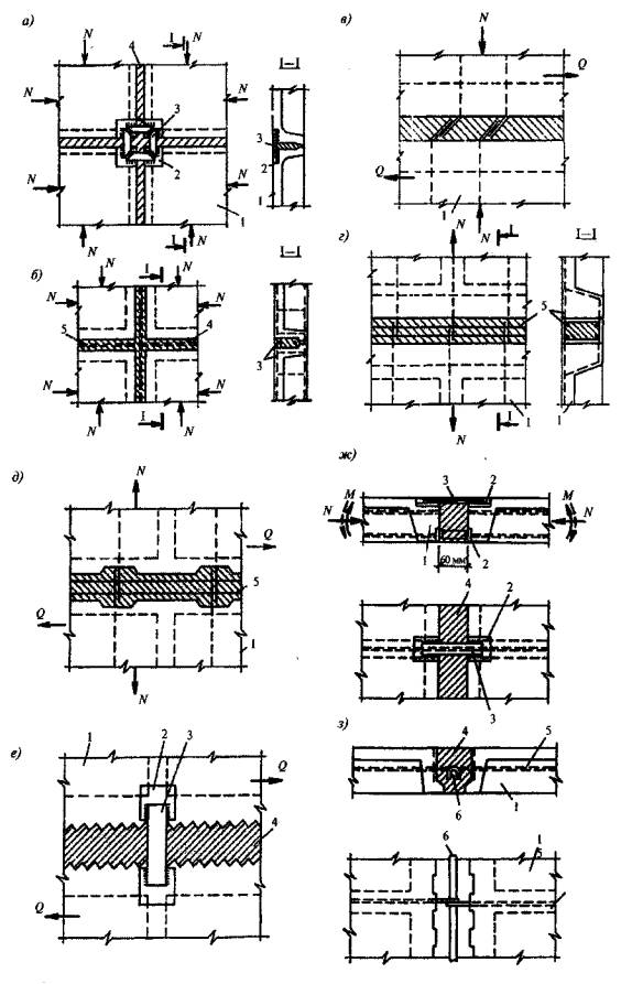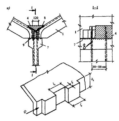 а - сжатый стык панелей со сварными накладками; б - то же, с перепуском арматуры; в - то же, с отгибами при наличии сдвигающих усилий; г - растянутый стык; д - то же, при наличии сдвигающих усилий; е - стык со сварной накладкой и шпонками, работающий на сдвиг; ж - то же, испытывающий сжатие с изгибом; з - стык панелей висячей оболочки на ванте; и - стык панелей и диафрагмы смежных оболочек и схема шпонки стыка; 1 - панель; 2 - закладная деталь; 3 - соединительная накладка; 4 - бетон замоноличивания; 5 - продольная арматура стыка; 6 - ванта в трубке с защитной смазкой; 7 - диафрагма с выпусками арматуры; 8 - сварной шов; 9 - шпонки Рисунок 6.5 - Схема стыков сборных конструкций 6.4.3 В стыках железобетонных элементов со стальными диафрагмами и бортовыми элементами вместо шпонок в металлической конструкции предусматриваются жесткие упоры и отрезки стержней (рис. 6.6). Жесткие упоры предусматриваются также в стыках с железобетонными диафрагмами в случае, если шпонок недостаточно для восприятия сдвигающих усилий.