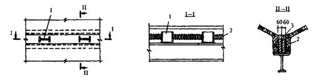 1 - стальной упор; 2 - шпонки; 3 - бетон замоноличивания Рисунок 6.6 - Схема стыков соединений железобетонных и металлических элементов 6.4.4 Соединение арматуры в стыках рекомендуется осуществлять сваркой стержней с закладными деталями или между собой, а также с перепуском концов стержней и сеток согласно требованиям п. 6.4.2 (ГОСТ 14098 и ГОСТ 10922). С целью уменьшения зоны перепуска арматуры допускается стыкование с помощью перепуска петель диаметром (или размером стороны) не менее 10d с заделкой в шов каждой петли на длину не менее 15d (здесь d - диаметр стыкуемых стержней). При расположении петель в вертикальной плоскости внутри петель по их периметру должны быть заложены продольные по стыку стержни (рис. 6.5, г, д). При расположении петель в горизонтальной плоскости к ним привариваются продольные стержни. Расчетные стыки на период монтажа допускается проектировать без замоноличивания, предусматривая передачу возникающих в них усилий через соединительные металлические детали (рис. 6.5, ж). Металлические детали стыков должны быть защищены от коррозии согласно СНиП 2.03.11. 6.4.5 Размер ширины стыков следует назначать с учетом положительных и отрицательных допусков для размеров собираемых элементов, но не менее 40 мм и, как правило, не более 150 мм. Передача монтажных сжимающих усилий в стыках допускается через металлические закладные детали без применения замоноличивания. При этом прочность бетона сборных элементов в стыке должна быть проверена на местное сжатие. Ширина раскрытия трещин на уровне арматуры должна быть не более допустимой по п. 6.4.5 СНиП 52-01. 6.4.6 С целью сокращения размеров и количества закладных деталей и стержней, проектируемых в стыке, а также упрощения работ по стыкованию арматуры допускается основную арматуру в элементах и в стыках покрытий сосредоточивать на отдельных небольших участках в зоне ребер, пересекаемых стыком (но не реже чем через 3 м), а при отсутствии ребер - на участках протяженностью 5-10 толщин плиты при расстоянии между участками 10-20 толщин плиты. 6.4.7 В стыках элементов, работающих на растяжение или изгиб, все растягивающие усилия должны быть восприняты надежно заанкеренной арматурой (как правило, являющейся продолжением основной арматуры ребер стыкуемых элементов). В стыках, воспринимающих касательные усилия сдвига с помощью шпонок, размеры выступов и углублений, образуемых в бетоне сборных элементов и в бетоне замоноличивания, должны удовлетворять расчету шпонок на смятие Q1 и срез Q2 по формулам: