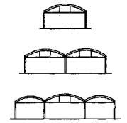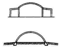 Рисунок 7.2 - Своды без затяжек 7.2 Очертание свода рекомендуется принимать по дуге окружности, параболе, цепной линии или другим близким к ним кривым. Своды призматического (полигонального) очертания состоят из прямолинейных участков, вписанных в дугу указанных выше кривых. Очертание сводов, секции которых состоят из трех и большего числа элементов, с целью сокращения числа типоразмеров элементов рекомендуется принимать по дуге окружности. 7.3 Стрелу подъема сводов (в ключе) в зависимости от назначения и размеров перекрываемого помещения, способов восприятия распора, архитектурных требований и других условий рекомендуется принимать в пределах от 1/2 до 1/10 величины перекрываемого пролета. 7.4 По форме поперечного сечения (вдоль образующей) сводчатые покрытия делятся на цилиндрические (с прямолинейной образующей верхней поверхности), складчатые и волнистые. Придание поперечному сечению сводов складчатого (треугольного, трапециевидного) или волнистого очертания (рис. 7.3) повышает несущую способность сводчатых покрытий и позволяет существенно увеличить их пролет.