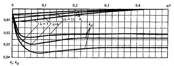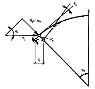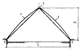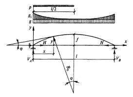 Нагрузку g1 в опорном сечении следует определять по формуле (7.1), принимая угол φ в этом сечении равным углу наклона элементов свода, примыкающих к опорам. Коэффициент k, учитывающий влияние смещения пят вследствие упругого удлинения затяжек и обжатия сводов на величину распора, определяется по формуле