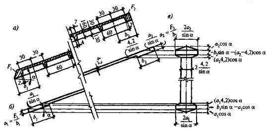 а - сечение панели свода; б - приведенное сечение панели; в - приведенное сечение складки свода Рисунок 7.5 - Приведенное поперечное сечение складки свода 7.15 Высота поперечного сечения складок свода h (рис. 7.3, б, тип 1) определяется из условия, чтобы определенная по деформированной схеме (СП 52-101) величина эксцентриситета приложения нормальной силы относительно центра тяжести сечения не превышала 0,7y, где у - расстояние от центра тяжести сечения до его края в сторону эксцентриситета. При соблюдении этого условия расчет сечений производят как для внецентренно сжатых бетонных элементов без учета сопротивления растянутой зоны. При этом в растянутой зоне сечения, согласно СП 52-101, должна быть установлена конструктивная арматура. С учетом знакопеременных изгибающих моментов эта арматура устанавливается в панелях у верхнего и нижнего краев поперечного сечения складки. В случае, если при соблюдении условия е0η ≤ 0,7y прочность складки окажется недостаточной, рекомендуется увеличить высоту ее поперечного сечения. По краям поперечного сечения складки в панелях устанавливается рабочая арматура, и сечение складки рассчитывается как железобетонное. Рабочая арматура в панелях устанавливается также в тех случаях, когда высота сечения складок ограничена архитектурными требованиями. 7.16 При расчете складчатых и полигональных сводов (рис. 7.3, б и рис. 7.8) следует учитывать дополнительный положительный изгибающий момент M1 возникающий вследствие прямолинейности участков складки или элементов полигональных сводов и определяемый по формуле