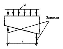 Рисунок 7.7 - Расчетная схема опорной панели Сплошные опорные панели (рис. 7.9) рассчитываются на изгиб в своей плоскости как балки-стенки на двух опорах от равномерно распределенных по сечению складки нормальных сжимающих сил. При этом принимают, что опорами панелей являются затяжки сводчатого покрытия (рис. 7.7). Величину растягивающего усилия в рабочей арматуре Ns, устанавливаемой у примыкающего к фермам продольного края панелей, допускается определять по формуле Ns = 0,2ql, (7.14) где ql - нормальное усилие, воспринимаемое опорной панелью между затяжками. Сечение арматуры в каркасах опорных панелей и расстояние между каркасами в обоих направлениях рекомендуется определять по расчету на поперечную силу и на раскрытие трещин.