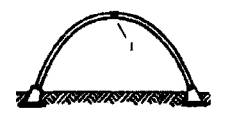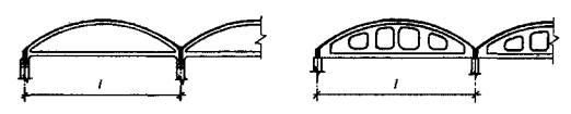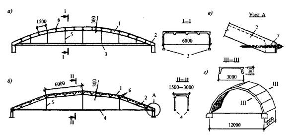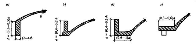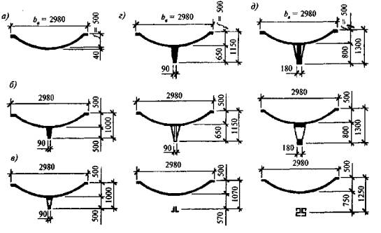 Рисунок 9.11 - Бортовые элементы 9.2.20 Средние и торцевые диафрагмы устраиваются обычно в виде арок с затяжкой (рис. 9.12). Это решение наиболее экономично по расходу материалов. При небольшом пролете волны оболочки и небольшой стреле подъема диафрагмы могут проектироваться в виде балок переменной высоты. Для облегчения диафрагмы и пропуска коммуникаций в стенке балок устраиваются отверстия. Возможны и другие, реже используемые диафрагмы в виде криволинейного бруса при опирании на стену; в виде рам с криволинейным ригелем, если распор воспринимается каркасом пристроек; в виде ферм при значительных пролетах волны оболочки и т.д. Диафрагмы обычно проектируются вертикальными, однако, при необходимости, они могут быть наклонными и криволинейными.