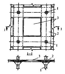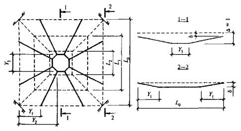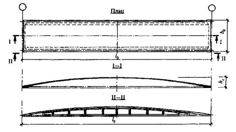Рисунок 9.13 - Схема оболочки с фонарным проемом Выбор схемы и очертаний элементов складчатых оболочек 9.2.22 Поперечное сечение монолитных складчатых покрытий проектируется по одному из типов, показанных на рис. 9.2. Ширину граней монолитной складки рекомендуется принимать не более 3-3,5 м, исходя из условия, чтобы толщина плиты получалась не более 100 мм. Ширина верхней грани в складках назначается равной (0,25-0,4)l2. Целесообразно, чтобы все грани были одинаковыми по ширине. При указанной предельной ширине граней складки длина волны монолитной складки может достигать не более 10-12 м. Сборные складки рекомендуется делать ребристыми. При величине l2 > 10-12 м рекомендуется применять складчатые с числом граней больше, чем указано на рис. 9.2, или в крайнем случае усиливать грани складки поперечными ребрами. Высоту складчатых оболочек без предварительного напряжения рекомендуется назначать не менее 1/10 l1 Бортовые элементы в них проектируются такими же, как и в цилиндрических оболочках (см. рис. 9.11). Предварительное определение сечений элементов оболочек 9.2.23 Для расчета оболочек необходимо предварительно задаться размерами сечений их элементов с учетом рекомендаций пп. 9.2.17, 9.2.19 и 9.2.22 настоящего СП. Для монолитных оболочек толщина плиты может назначаться равной (1/200-1/300)l2, но не менее 50 мм. Толщина плит сборных и сборно-монолитных оболочек принимается не менее 30 мм. Во