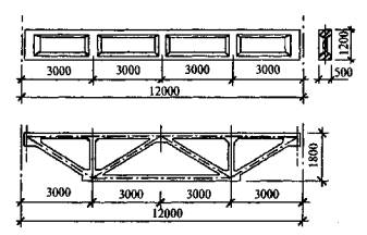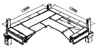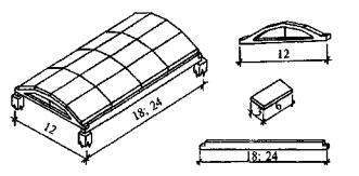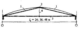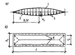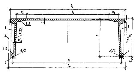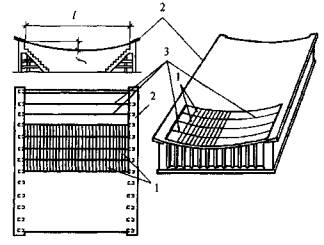Рисунок 7.13 - Трапециевидное поперечное сечение элемента свода 7.35 Толщину горизонтальных полок по верхнему и нижнему краям поперечного сечения элементов сводов, в которых устанавливается рабочая (или конструктивная) арматура, рекомендуется принимать не менее 60 мм, а боковых наклонных граней, армируемых сетками из обыкновенной арматурной проволоки, - не менее 30 мм. 7.36 Соединение трапециевидных элементов складок рекомендуется выполнять с помощью сварки закладных деталей на торцевых частях элементов и последующего замоноличивания швов мелкозернистым бетоном. Для стыкования продольной арматуры, расположенной в полках складок, предусматриваются закладные пластины, приваренные к концам арматурных стержней. 7.37 Сводчатые покрытия пролетом до 24 м с трапециевидным поперечным сечением складок рекомендуется проектировать с учетом монтажа складок укрупненными блоками длиной, равной величине перекрываемого пролета. Конструирование волнистых сводов7.38 Если волнистые своды состоят из элементов, поперечное сечение которых имеет вид, представленный на рис. 7.3, в, тип 1, они носят название бочарных сводов. Для бочарных сводов пролетами от 48 до 100 м, нашедших применение в строительстве, отношение стрелы подъема к пролету принималось в диапазоне 1/10 - 1/12. Ширина свода 6-12 м. Поверхность бочарного свода образуется перемещением вдоль оси дуги окружности или параболы таким образом, что плоскость образующей остается перпендикулярной оси свода. Опорная зона свода имеет переменную высоту сечения, постепенно переходящую от профиля средней зоны к прямой линии опор. Форма поверхности сборных плит может быть различной в зависимости от схемы разрезки - продольной или поперечной. Размеры сборных ребристых плит обычно 3×6 или 3×12 м. Боковые поверхности ребер плит выполняются со шпонками, обеспечивающими передачу сдвигающих усилий. Соединение плит между собой производится обычно сваркой закладных деталей или выпусков арматуры. Затяжки бочарных сводов могут выполняться предварительно напряженными железобетонными или стальными. В качестве напрягаемых элементов применяют стержневую арматуру и высокопрочную проволочную арматуру в виде прядей и стальных канатов. Затяжки, воспринимающие распор свода, крепятся непосредственно к опорным балкам, воспринимающим вертикальные и горизонтальные (в промежутках между затяжками) нагрузки (рис. 7.14).