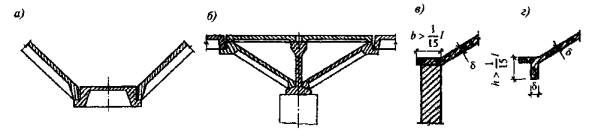 1 - ребра по поперечным краям элементов Рисунок 7.16 - Поперечное сечение волнистого свода двоякой кривизны (тип 3) 8 Треугольные и трапециевидные складкиОбщие положения8.1 Складчатые железобетонные пространственные конструкции состоят из плоских элементов - граней, соединенных между собой под углом так, что в месте их сопряжения образуется прямолинейное ребро, через которое от одной грани к другой могут передаваться возникающие в них усилия (касательные усилия, нормальные усилия и изгибающие моменты). В стыке граней рекомендуется предусматривать утолщения (вуты), что позволяет улучшить работу сопряжений граней на изгиб, упростить устройство опалубки и улучшить размещение арматуры. 8.2 Складчатые конструкции могут быть разделены на две основные группы: балочные складки и призматические складки или складчатые оболочки. К балочным складкам могут быть отнесены треугольные и трапециевидные складки с жестким поперечным сечением, которые могут быть рассчитаны и законструированы по схеме простой балки в предположении линейного распределения продольных деформаций по высоте сечения. В этом случае часто для повышения жесткости граней из их плоскости предусматриваются подкрепляющие ребра или диафрагмы жесткости. Призматические складки или складчатые оболочки рассчитывают и проектируют с учетом деформаций поперечного контура. Призматические складки аналогично длинным цилиндрическим оболочкам имеют продольные бортовые балки, в которых размещается вся или большая часть продольной растянутой арматуры, и поперечные жесткие диафрагмы по торцам складок (см. п. 8.6 настоящего СП). 8.3 Конструктивные схемы треугольных и трапециевидных складок и некоторых складчатых систем из них для покрытий и перекрытий приведены на рис. 8.1.