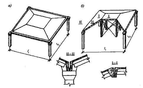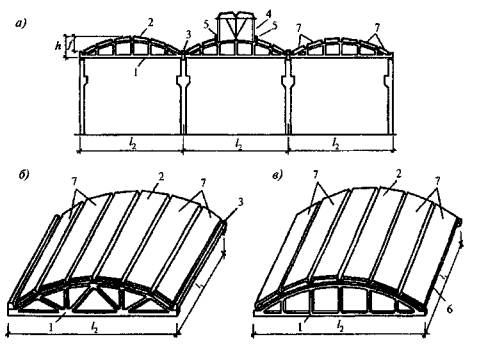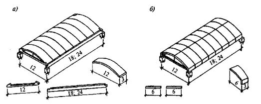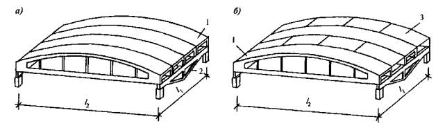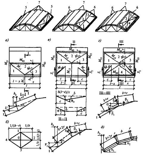 а - из бортовых балок, криволинейных ребристых панелей и затяжек диафрагм; б - из криволинейных ребристых панелей с бортовым элементом и затяжек диафрагм Рисунок 9.14 - Схемы членения сборных длинных цилиндрических оболочек и складок